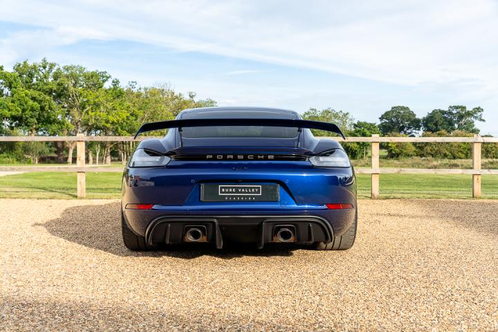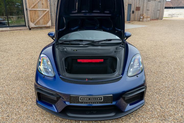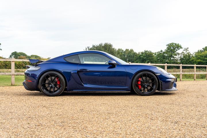 A superb example of the 718 Cayman GT4, finished in Gentian Blue Metallic with a Black Race-Tex interior, black leather accents and contrasting silver stitching. Powered by the 4.0-litre flat six producing 420bhp, paired with the lightning fast PDK transmission, this GT4 delivers an exhilarating and precise driving experience. The car is presented in exceptional condition throughout and benefits from a professional exterior detail including two stage paint correction and ceramic coating, leaving the Gentian Blue paintwork looking exceptional. Registered in 2022 and showing just 9,971 miles, this car comes with a full Porsche service history. The most recent service was completed in March 2024 at 6,028 miles, with PADM mounts replaced under warranty and a full health check in April 2025. MOT runs until March 2026, and Porsche Warranty is valid through to the end of March 2026.