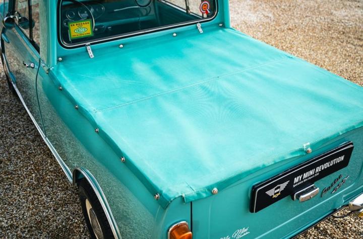Ce charmant Morris Mini Pick-Up de 1975, dans sa teinte Aquamarine, est dans une configuration absolument authentique.