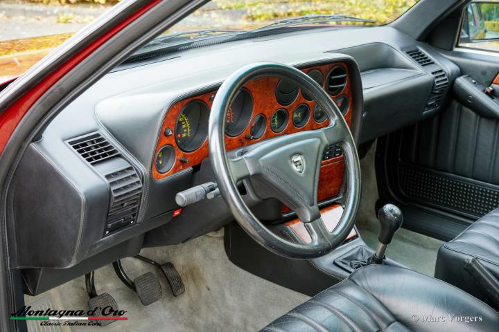 Lancia Thema Ferrari 8.32, jaar 1988. Chassisnummer ZLA834000*00158436*, motornummer F1050046*16585*. Exterieur in rood metallic (Rosso Winner 179/F) gecombineerd met een zwartlederen interieur van Poltrona Frau en grijs tapijt.