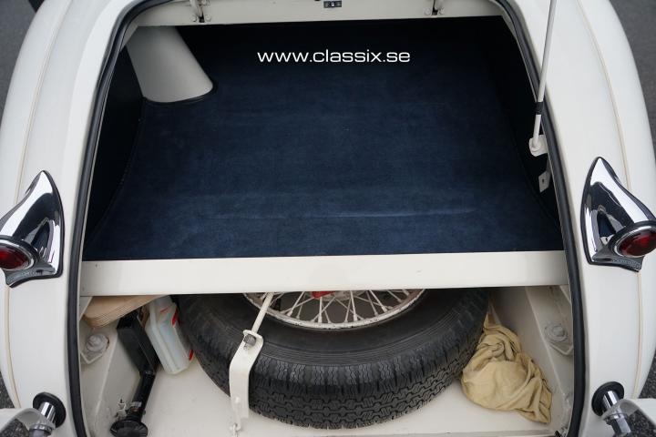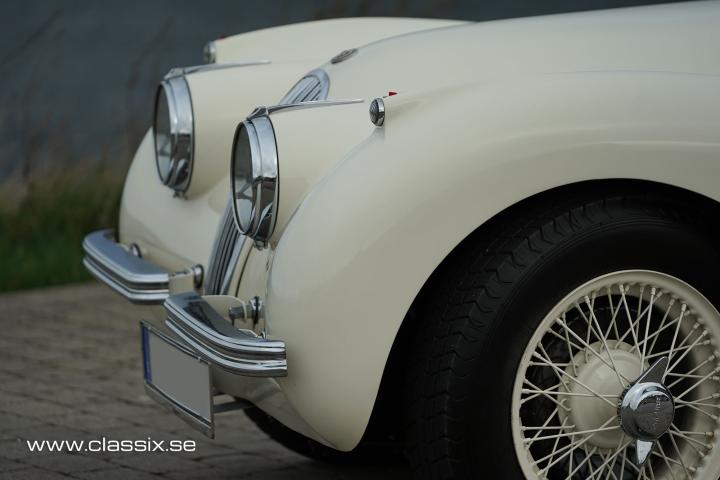 Exterior: The Jaguar XK120 M we have for sale today is a striking car in white. It looks a bit sportier than the standard XK, with its lower ride height and wire wheels. The paintwork on this car is absolutely stunning, as are all the chrome details. All panel gaps are perfect, and the doors open and close effortlessly, even with new rubber trim. The teardrop design and split front screen of the Jaguar XK120 Coupe reminds you of the style of exclusive French cars from the 1940s. The spoke wheels are in good condition and fitted with Michelin Pilote X tires, which are the best available tires for these cars.
