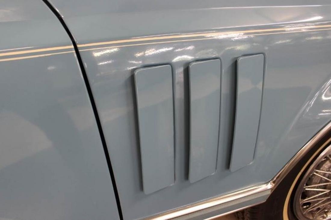 Painted a nice Diamond Blue with a White pin stripe that is original. The White top is original. Dual outside mirrors, body side molding is the same color as the car. Hubcaps, white wall tires, Rocker panel molding, power antenna, Hideaway head lights, bumper guards in front & rear. Wheel well moldings. All original outside and looks beautiful.