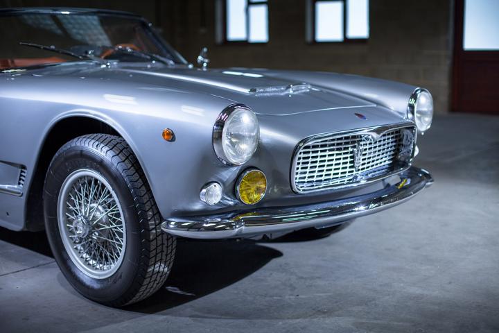 The 3500 GT was built on a tube platform chassis, constructed from tubes of square, round or elliptic section of Superleggera construction. Front suspension was by double wishbone coil springs, at the rear there was a Salisbury solid axle on semi-elliptic leaf springs, with hydraulic dampers an anti-roll bar and a longitudinal torque arm. Steering was of the recirculating ball type. The hydraulic brakes were initially Girling 12″ finned drum brakes front and rear; disc brakes were later introduced on the front wheels, and finally on all four. This Maserati 3500GT Vignale Spyder is equipped with front disc brakes and the optional Borrani knock-off wire wheels as well as a factory hardtop.