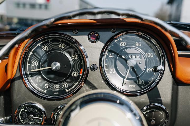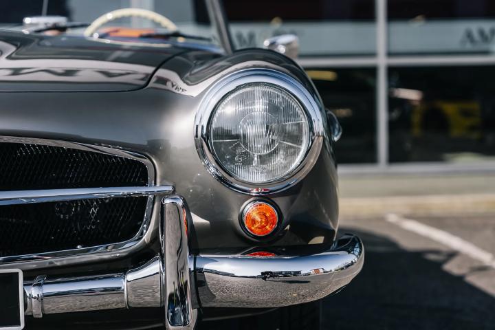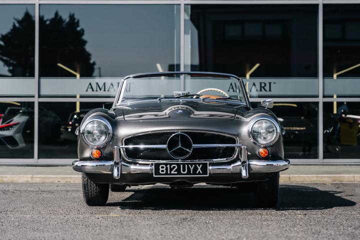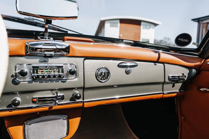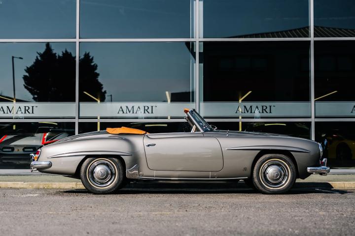 The 1959 Mercedes-Benz 190 SL is a classic roadster that epitomizes the elegance and engineering excellence of its era. This particular model, currently available for sale, has undergone a meticulous restoration by the renowned German company, Arthur Bechtel Classic Motors, ensuring it is presented in pristine condition. The vehicle boasts a sophisticated Anthrazit exterior complemented by a luxurious Cognac leather interior. Having been registered with the UK's Driver and Vehicle Licensing Agency (DVLA) in September 2017, it has since been driven a mere 88 miles, effectively rendering it in near-new condition. As a left-hand drive model, it retains its original driving configuration, appealing to purists and collectors alike.