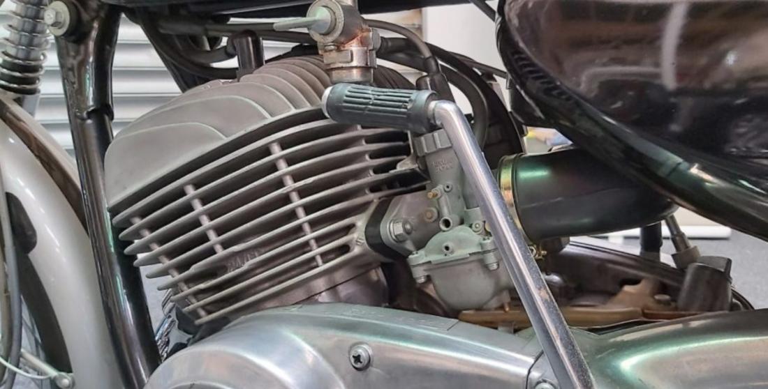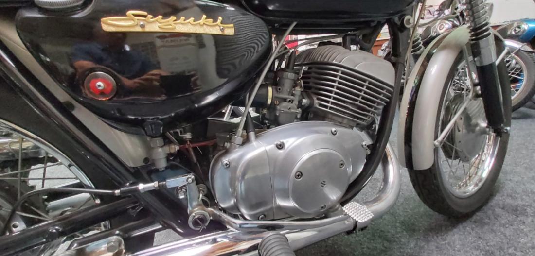 This Suzuki T20 is a two stroke, twin cylinder engine and six speed gearbox.