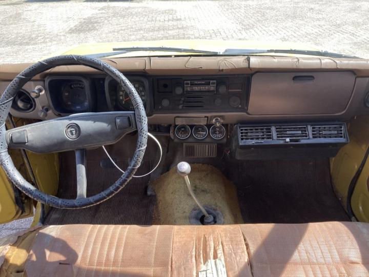 The sand yellow paint is original in most places and surely shows its age. Hence, a thorough repaint should be carried out at this point. Of course this old workhorse has a few dents: on the roof panel, the driver’s side door and the driver’s side load bed. Furthermore, the driver’s side door glass is broken and should be replicated or replaced.