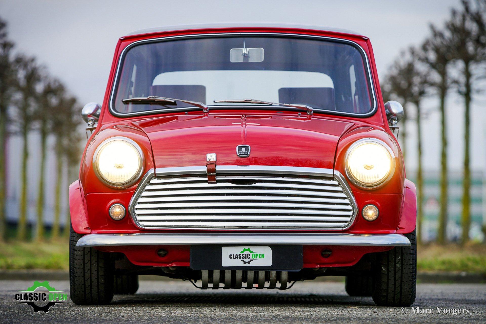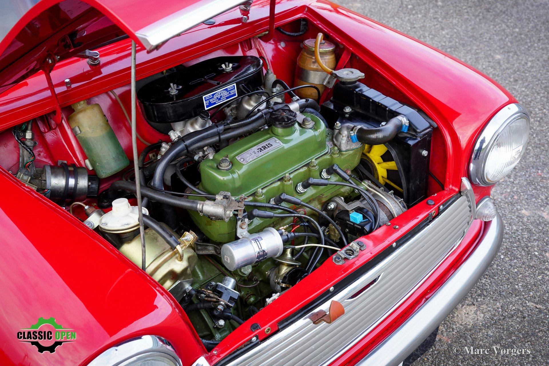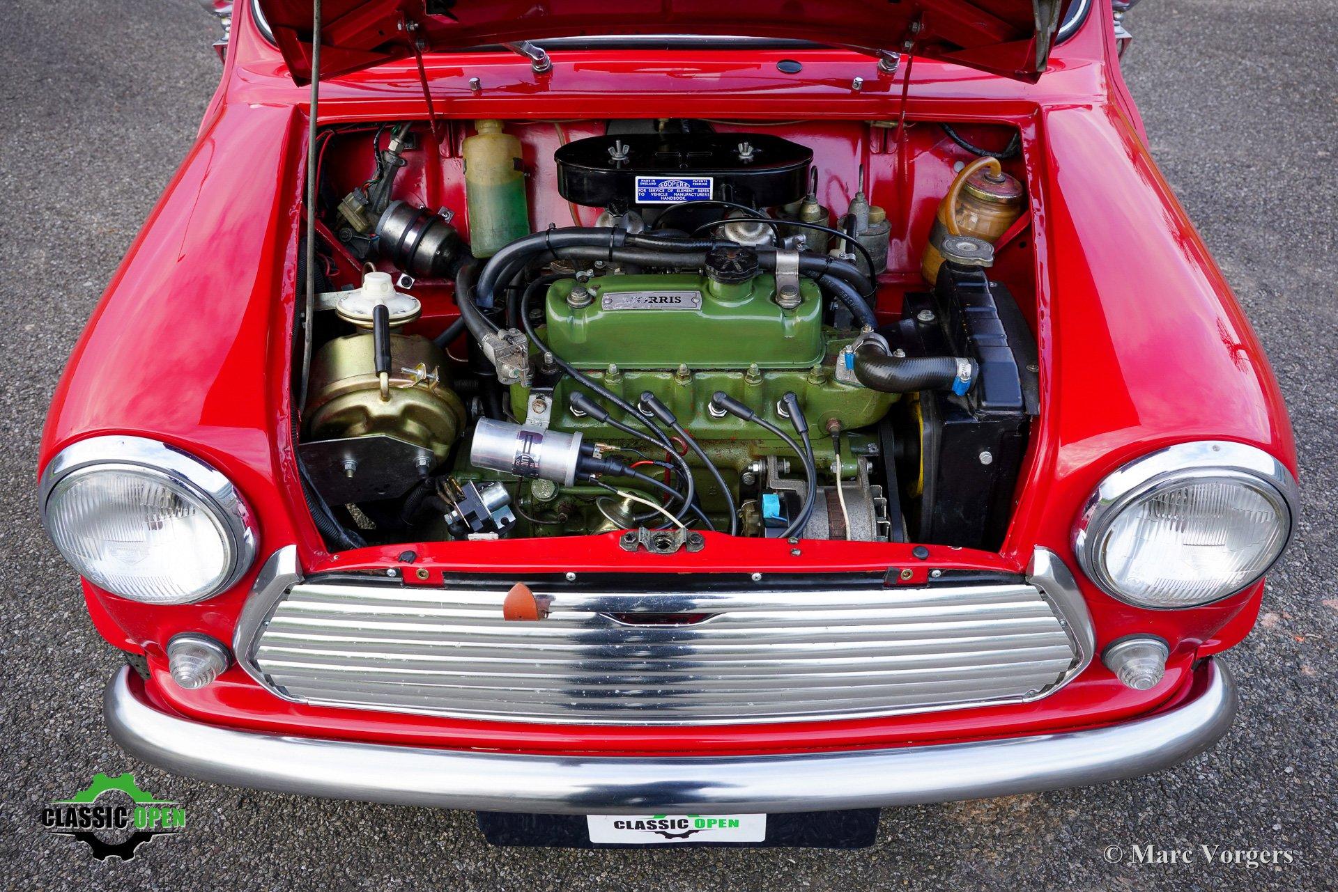 Deze Morris Mini Cooper is in het verleden gerestaureerd en gereviseerd. De auto is voorzien van een krachtige Cooper S 1275 cc-motor met twee S.U.-carburateurs, elektronische ontsteking en andere upgrades om de Cooper S-specificaties te benaderen.