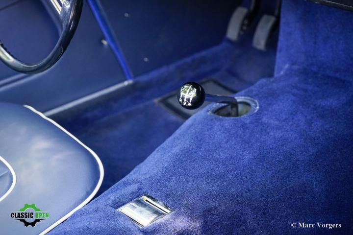 Exterieurkleur: ijsblauw metallic gecombineerd met een donkerblauw lederen interieur met witte biezen en donkerblauw tapijt. Zwarte soft-top en aluminium zijruitframes.