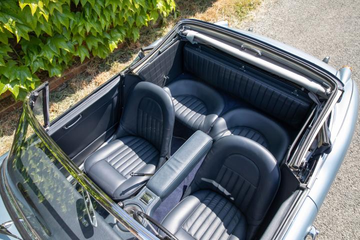 Inside the interior has been fully re-trimmed with leather facings in Navy Blue with Navy edge bound carpet and a Walnut dash. The car has a new Navy Everflex roof with light lining (as per original) which is of very good fit.