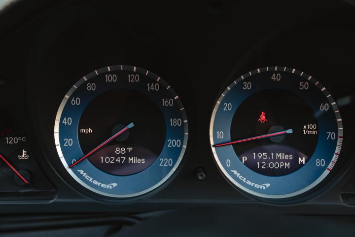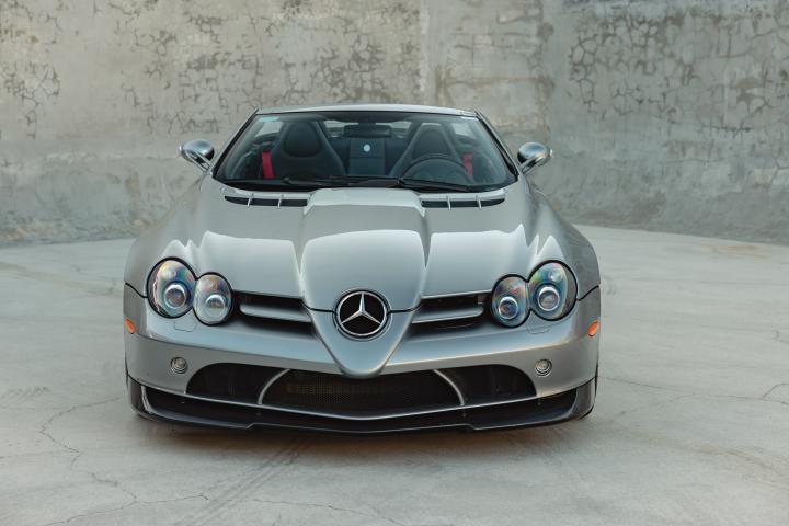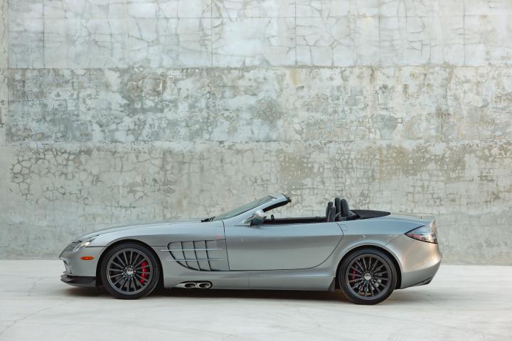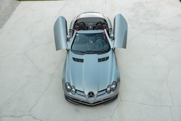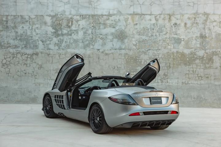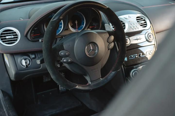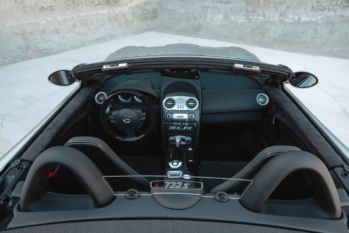 Performance upgrades over the standard SLR Roadster include a lowered suspension, larger carbon-ceramic brakes, stiffer damping, a carbon-fiber front splitter, and unique 19-inch wheels. Top speed is rated at 208 mph, with 0–60 mph in just 3.7 seconds.
