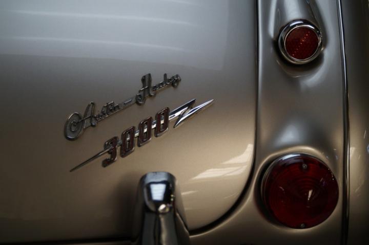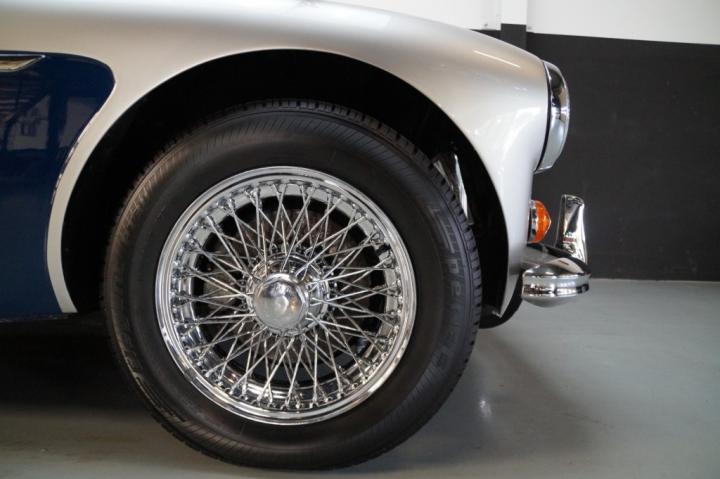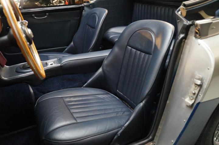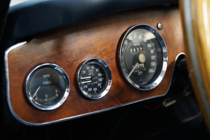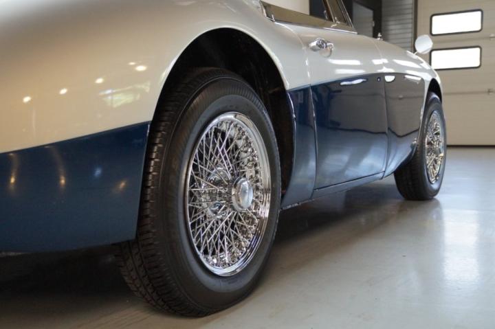 Inside, the Healey is fitted with a dark blue leather interior that complements the exterior perfectly. The upholstery is in beautiful condition, showing minimal wear and excellent craftsmanship. The dashboard is clean, with all original Smiths instruments functioning properly — no broken dials, missing switches, or modifications.