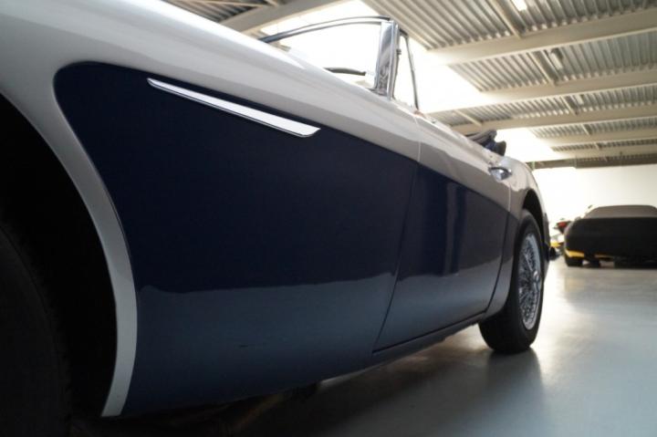 A beautifully preserved and well-documented 1965 Austin Healey 3000 Mark III BJ8, finished in an elegant two-tone combination of silver over blue — a colour scheme that highlights the graceful lines of this iconic British roadster.