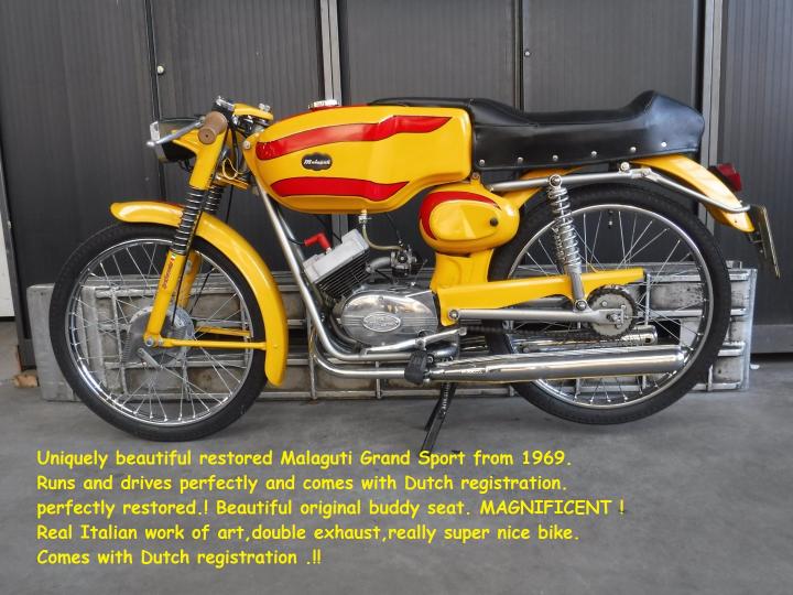 Uniek mooie gerestaureerde Malaguti Grand Sport van 1969. Loopt en rijdt perfect en komt met NL kenteken. Zeer netjes gerestaureerd. Prachtig origineel doorlopend buddyseat. PRACHTIG! Echt Italiaans kunstwerk, dubbele uitlaat, echt super !! Grootste keus in ECHTE klassiekers met meer dan 450 stuks in de Stolze Collectie: van project tot perfect !