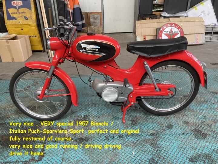 Zeer mooie speciale 1957 Bianchi Italiaanse Puch Sparviero Sport. Gerestaureerd, dus weer helemaal in supernette staat. Zeer mooi en goed rijdend. Grootste keus in ECHTE klassiekers met meer dan 450 stuks in "de Stolze Collectie", van project tot perfect !