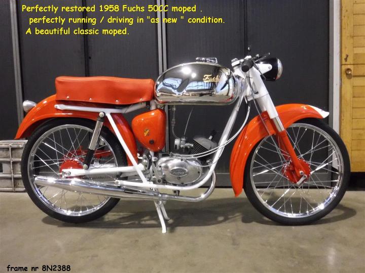 Perfect gerestaureerde 1958 Fuchs 50 cc bromfiets.Rijdt perfect, is in als nieuw conditie. Een prachtige klassieke bromfiets ! Grootste keus in ECHTE klassiekers met meer dan 450 stuks in "de Stolze Collectie", van project tot perfect !
