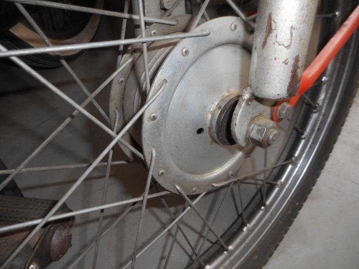 Een bijzondere brommer. Een oranje Vechietti. Hij staat hier te koop.Het frame is van een Negrini. Grote keus in motor- en bromfietsen in de Stolze Collectie!