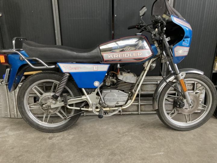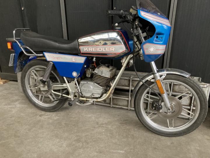 Hier een speciale 80cc Kreidler. Mooi exemplaar ! Lichte motorfiets met NL kenteken klaar voor gebruik. Grootste keus in ECHTE klassiekers met meer dan 450 stuks in de Stolze Collectie: van project tot perfect !