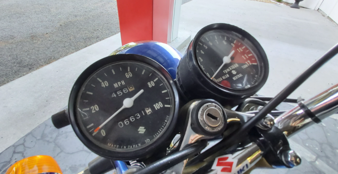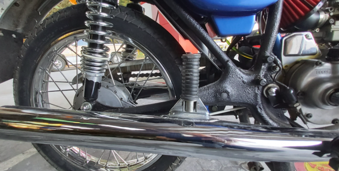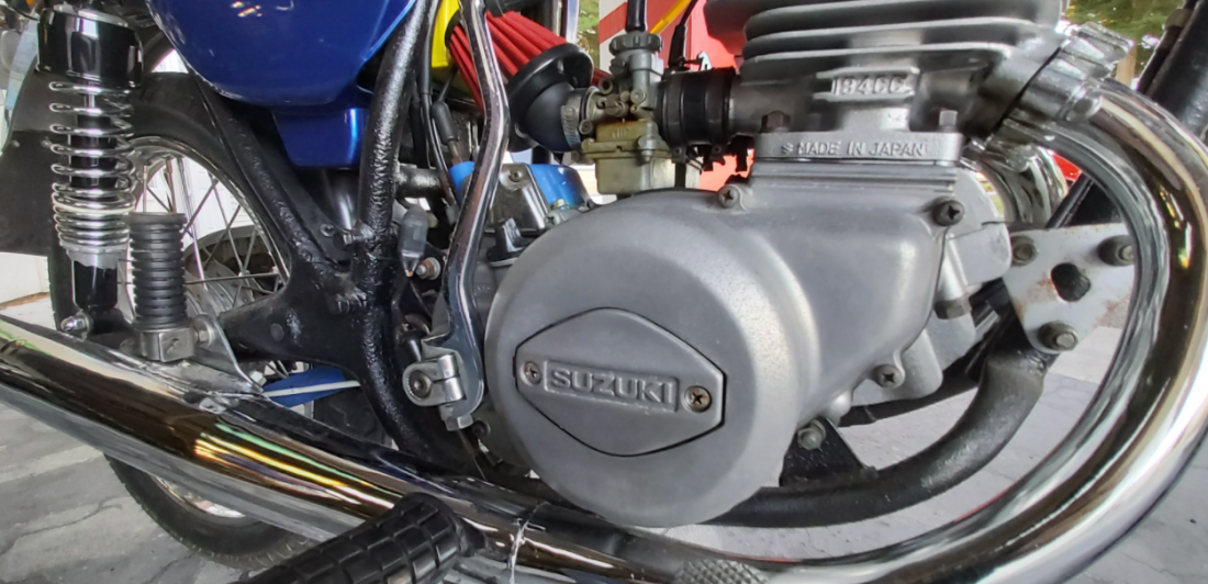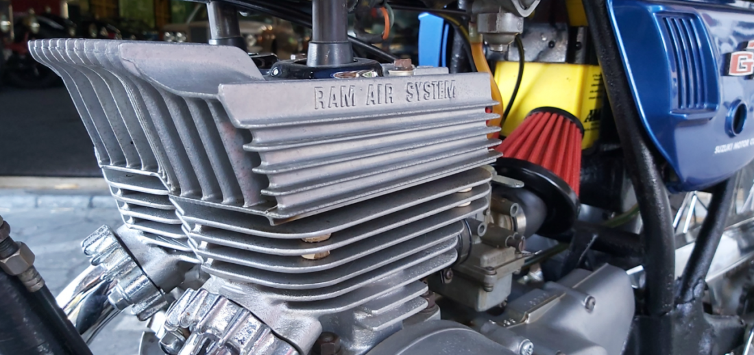 Suzuki was in its two-stroke stage back then, and had built some exceptional machines in the late 1960s, followed by the excellent triples. One innovation of which the company was most proud was the Ram Air concept, very apparent on this little twin. Take a close look and one sees that this is a vertical twin, parallel cylinders standing upright. The cylinders are perfectly square, 49mm by 49mm, and the air rams are actually built into the cylinder heads. As opposed to being bolted on, as with the 380 and 550 triples.